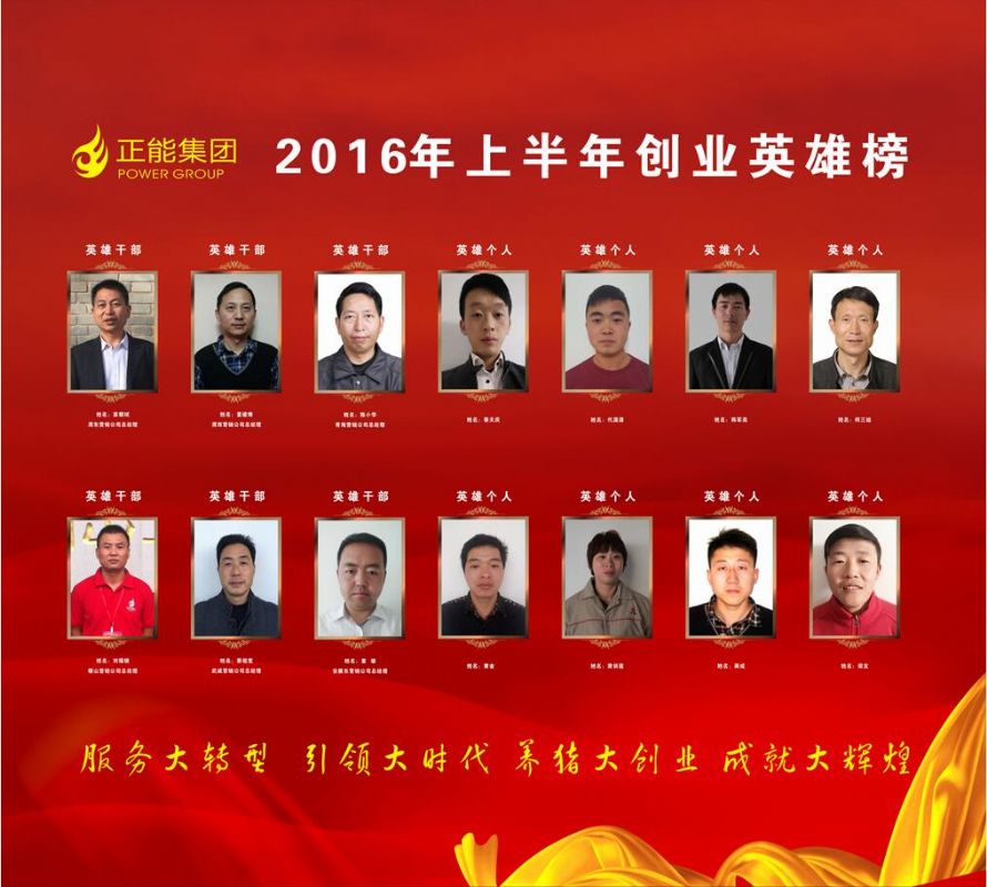 2016年7月19日晚19:00-21:00,“正能集團股權轉讓儀式暨2016年上半年創業英雄頒獎晚會”在西北革命圣地-銅川照金隆重舉行。今夜的照金賓館五樓會議廳華燈璀璨、高朋滿座,正能集團總裁王義輝、集團產品技術總監連星、財務總監朱武寧、高陵基地總經理白萬禮、渭南、西安、咸陽、甘肅、山西、隴東等事業部、營銷公司總經理出席晚會。正能創業英雄戰將共計100余人參加本次晚會。本次大會以“服務大轉型、引領大時代、養豬大創業、成就大輝煌”為主題,以開闊的視野、創新的形勢,引爆巨大能量場,聚英雄氣概,展團隊風采,亮大帥風姿,迸發激情,總結2016上半年輝煌成就,斗志昂揚,展望2016下半年宏偉藍圖。